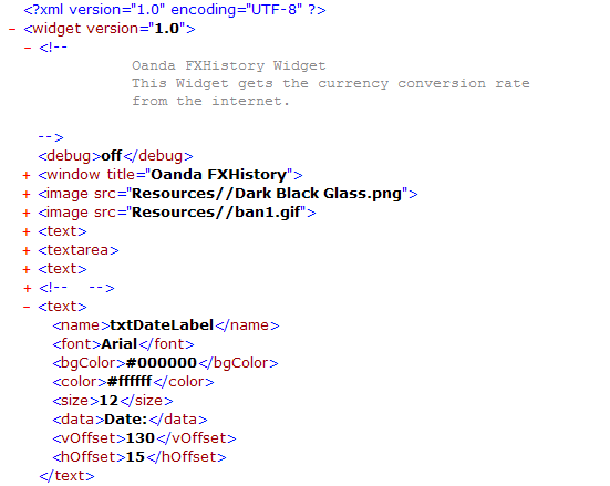 The widget must be placed on the desktop using absolute positioning in pixels. In general this pixel-based positioning and sizing is true for all the components of the widget - I guess resizing could be implemented in Javascript, but it is not a feature of the Konfabulator environment. When the main Widget window has been defined, the various components can be laid out on top of the window using pixel positioning. By default, the window is transparent, and usually widget writers place background images (typically not just rectangular shapes) into these windows. You can use all the usual image formats, like JPG, PNG and GIF images. I tend to use XML comments to separate segments of these widgets, as a long flat list of components could be difficult to navigate.